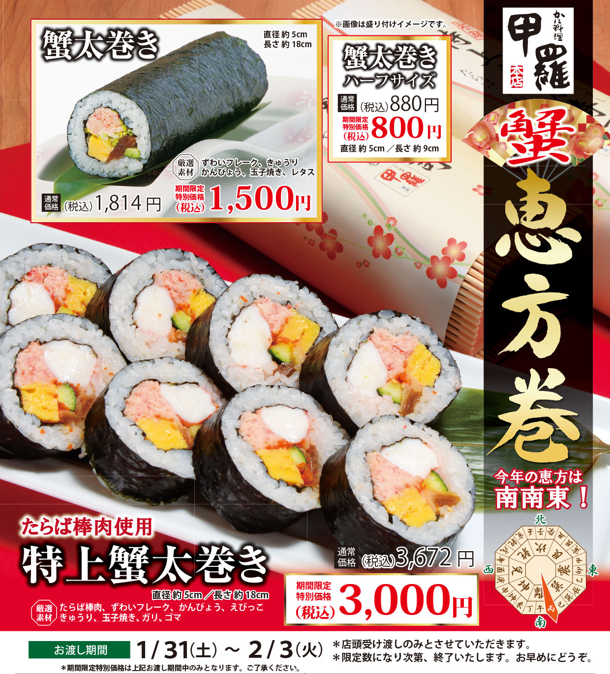 年に一度の縁起物で福を呼ぼう!今年の恵方は南南東です。恵方を向いてまるかぶり!