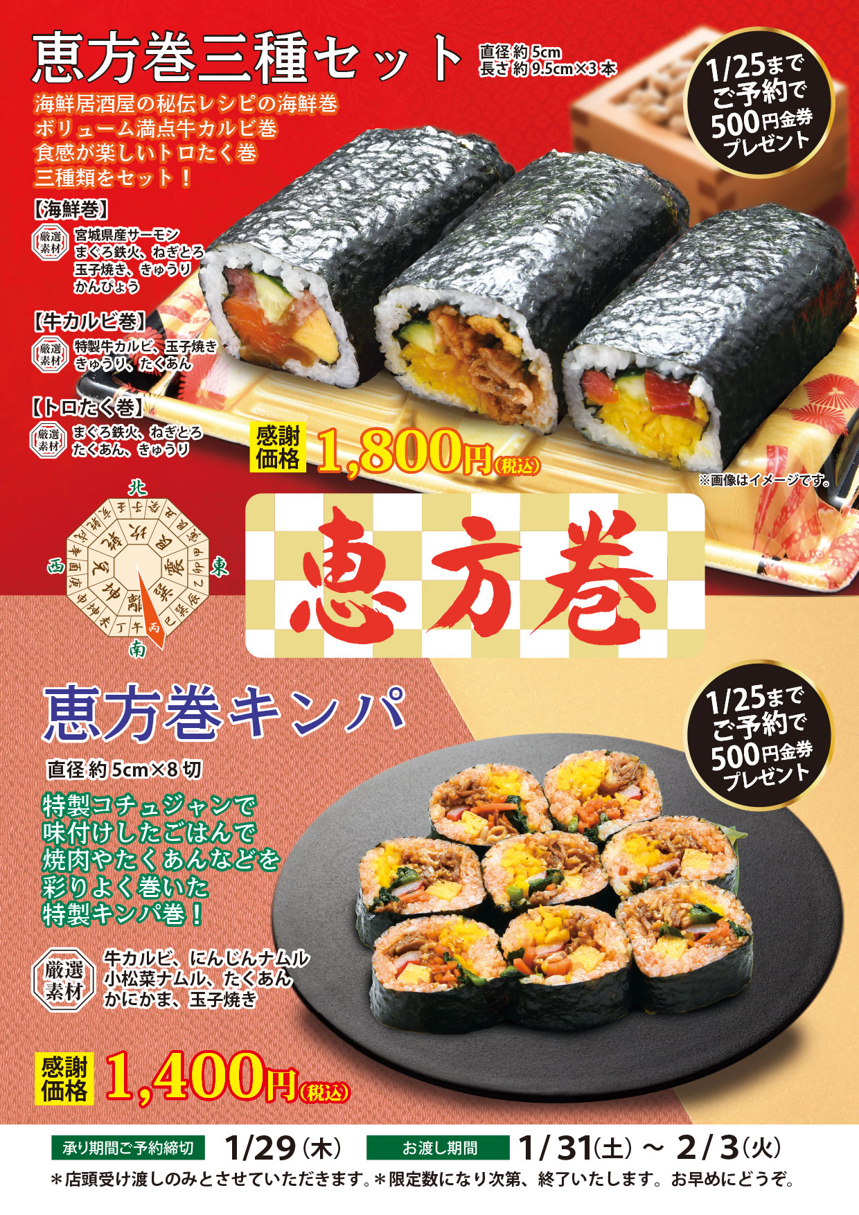 こだわりの具材をたっぷり巻き込んだ恵方巻は福を呼ぶ縁起の良い食べ物です。