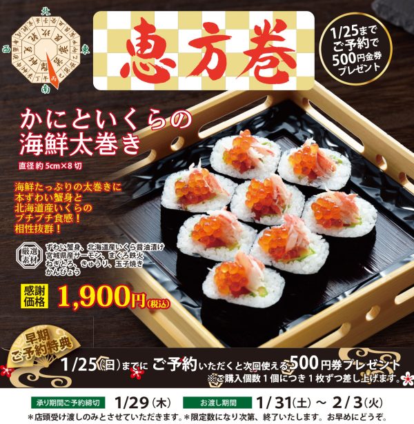 年に一度の縁起物で福を呼ぼう!今年の恵方は南南東です。恵方を向いてまるかぶり!