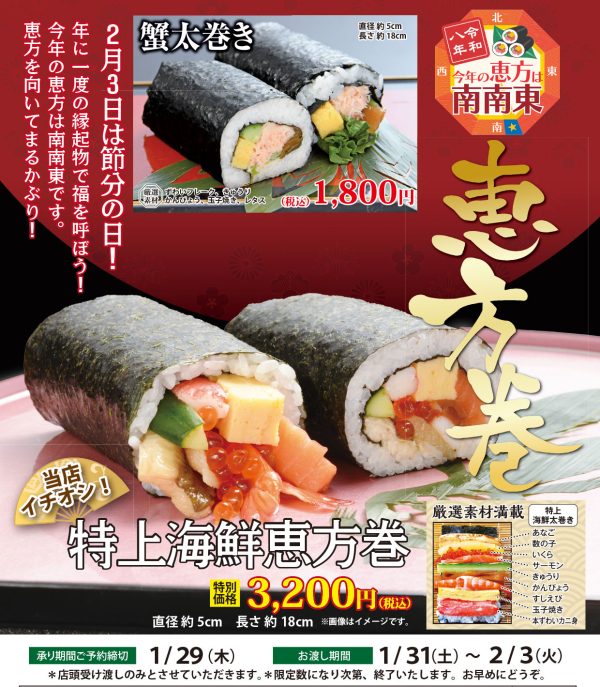 年に一度の縁起物で福を呼ぼう!今年の恵方は南南東です。恵方を向いてまるかぶり!