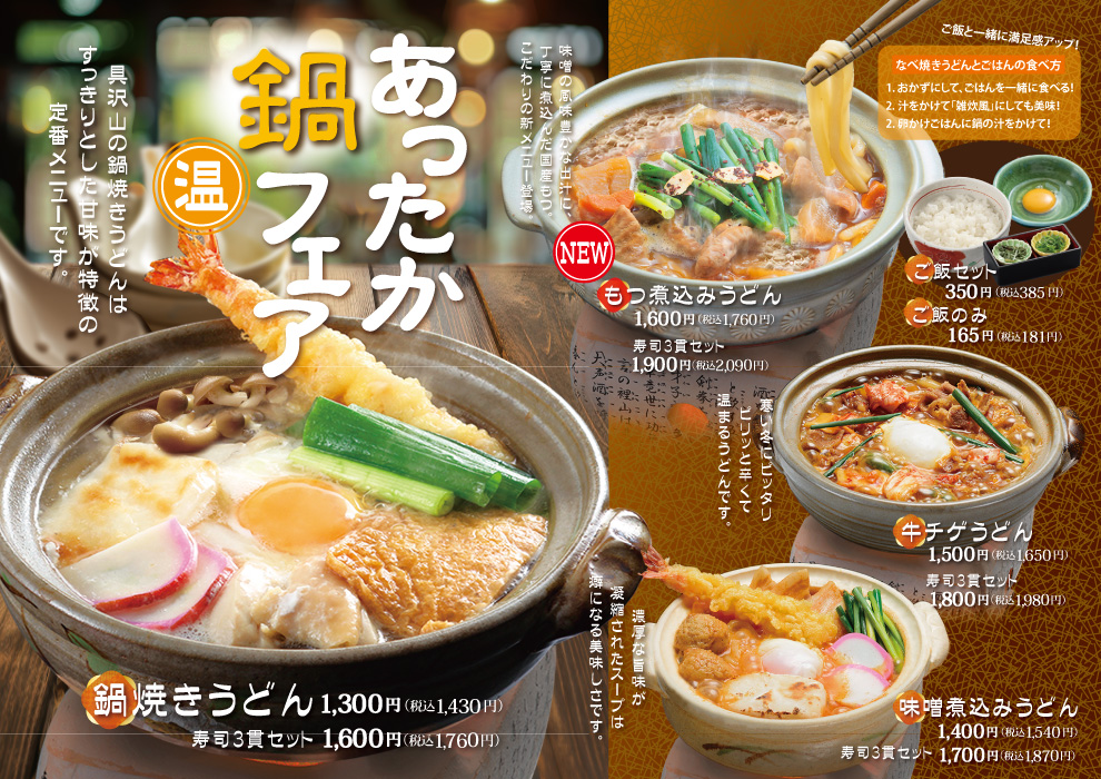 ●鍋焼きうどん:税込1430円 ●もつ煮込みうどん:税込1760 ●牛ちげうどん:税込1650   ●味噌煮込みうどん:税込1540円 ●寿司三貫セット+330円 ●ご飯セット+385円