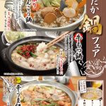 寒いときにはやっぱり鍋!今年は2種の鍋が新登場。○日本海水揚げのあんこうを店内で捌いてご提供「肝たっぷりあんこう蟹鍋」○出汁のうまみが染み込んだ「柚子香る 真鱈と白子のみぞれ蟹鍋」そのほか定番の「牛もつ鍋」「辛うま鍋」も […]